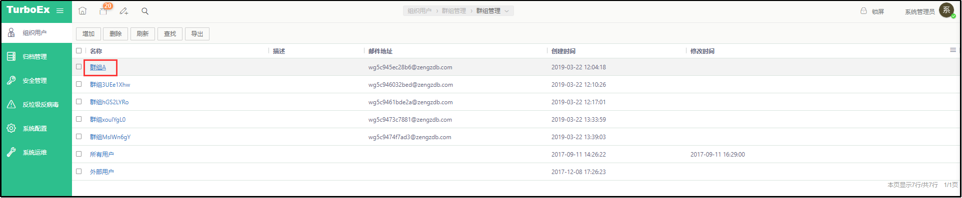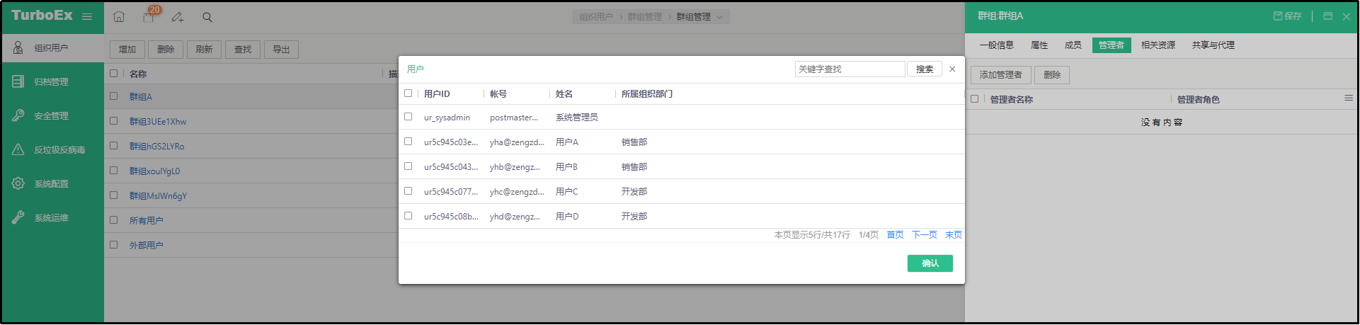 功能 邮件系统 日程协同 网络云盘 在线会议 审批工作流 安装与配置 TurboEx for Linux 安装 TurboEx for windows 安装 WEB管理平台和H5访问方法 TurboEx for PC 客户端 TurboEx for Android 常见问题 常见配置问题 TurboEx-安装以及启动 TurboEx-如何创建群组管理员 TurboEx-如何创建组织部门管理员 TurboEx-如何删除组织部门里的机构 TurboEx-如何停用用户的账号 TurboEx-如何修改组织部门里的机构名称 常见运维问题 TurboEx-常见维护问题 TurboEx-杀毒软件设置问题 TurboEx-域名和DNS TurboEx-自定义目录密码忘记的处理办法 常见退信内容诊断 TurboEx-收发邮件问题 企业邮件常见退信内容诊断 步骤一:以管理者身份进入组织用户-群组管理,选择一个群组。(如群组A) 步骤二:进入编辑界面选择管理者,从用户列表指定一名用户为管理者后点击确认。