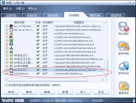 瑞星杀毒软件和防火墙默认会阻止邮件服务器和Webmail 服务的运行,可按一些步骤进行设置,使得邮件服务器正常运行