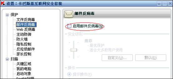 - 关闭卡巴的邮件反病毒功能,这样您的TurboMail邮件服务器才能正常启动。