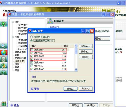 如果您的服务器安装了卡巴斯基杀毒软件请按以下方式设置,以保持TurboMail服务器能正常使用。