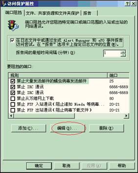 - 选择“禁止大量发送邮件的蠕虫病毒发送邮件”,点“编辑”,进入“添加或编辑端口阻挡范围”界面。