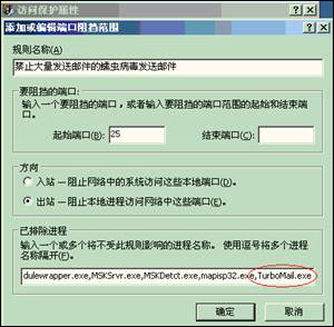 - 在“已排除进程”输入turboMail.exe,按“确定”保存。