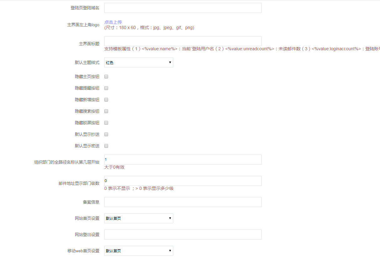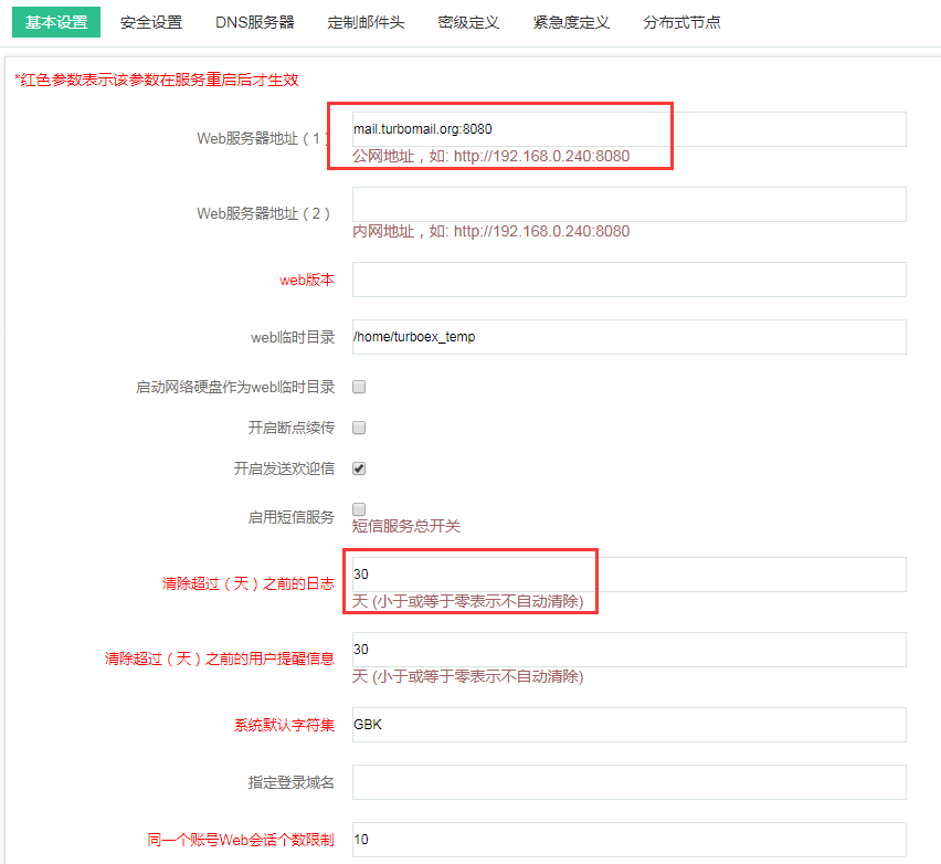 - 设置“Web服务地址”一般用于用户登录WebMail事下载附件的指定路径,设置“清除超过(天)之前的日志”,一般保留一个月的日志即可。