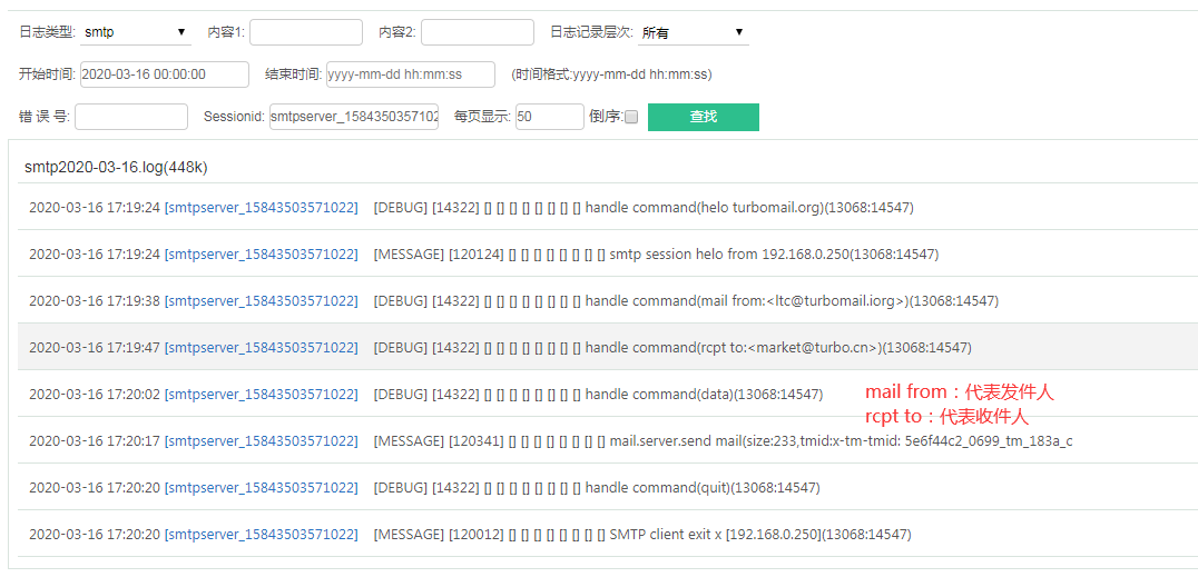 - 公网账户发送邮件到TurboEx邮件系统内账户查询“smtp日志”