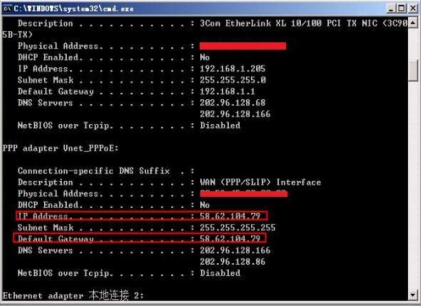 连接上网通过运行 CMD执行 ipconfig /all命令可以查看到,PPP拨号连接所获取到得是一个公网 IP地址,这种类型的网络是不需要做端口映射的(如下图所示)。
