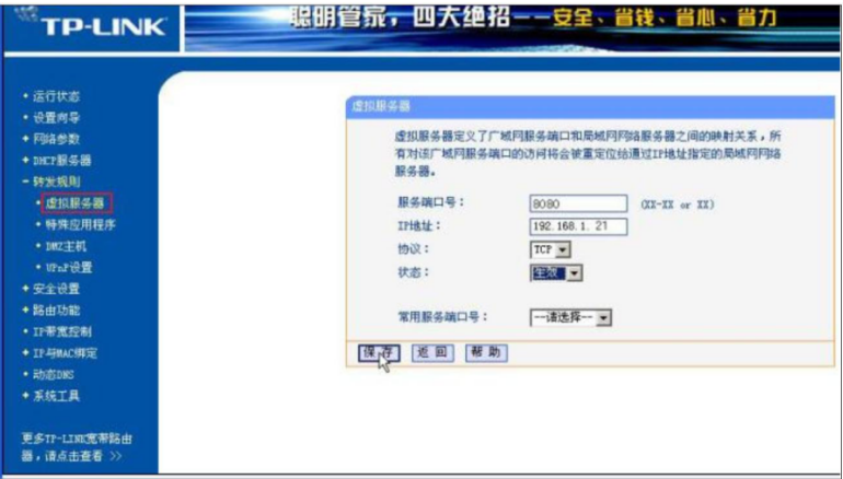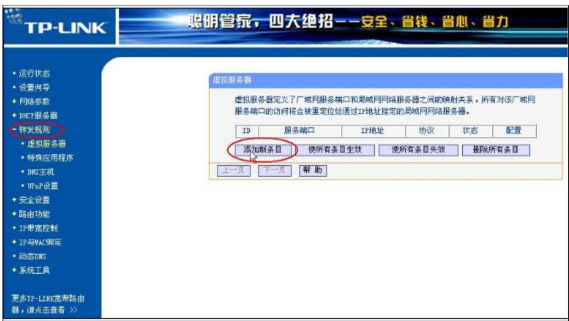 - 内网 192.168.1.21 是 TurboEx 服务器,TP-LINK 系列路由器的默认管理地址为192.168.0.1,账号 admin密码 admin 登录到路由器的管理界面,点击路由器的转发规则—虚拟服务器—添加新条目(如图)