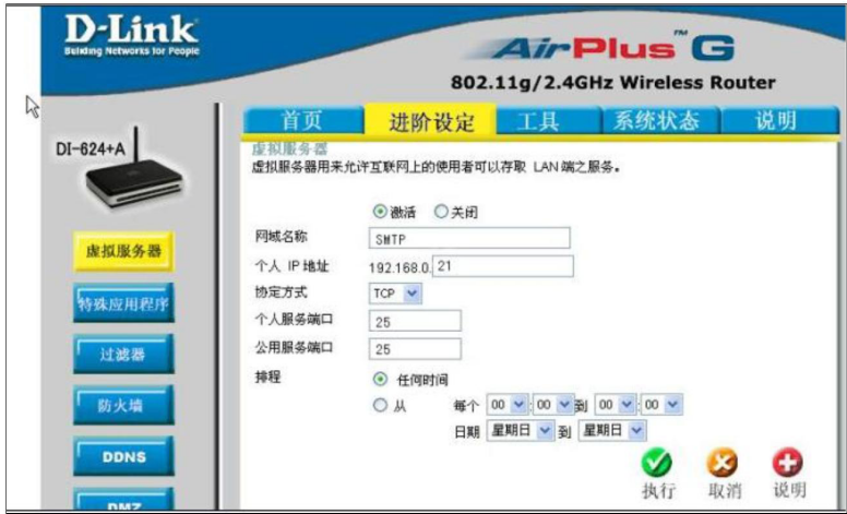 - 点路由器的进阶设定—虚拟服务器进行设置,首先需要在上方点激活,此项设置才生效。
