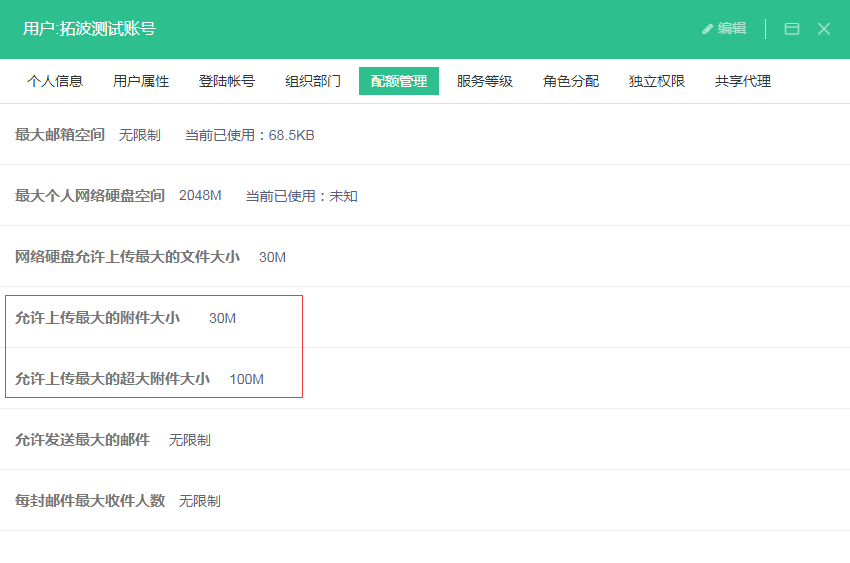 - 登录postmaster管理员账号》用户管理》点击“用户”》点击“编辑”》点击“配额管理”,设置允许个人用户附件上传大小