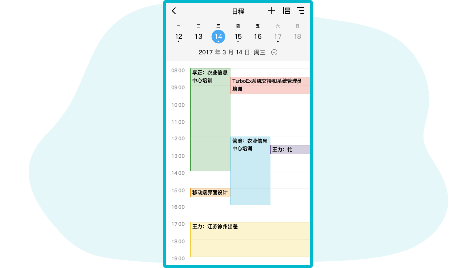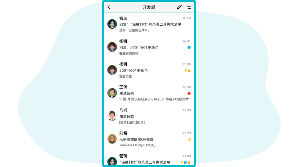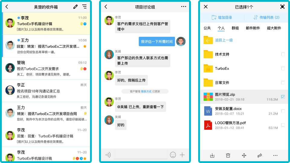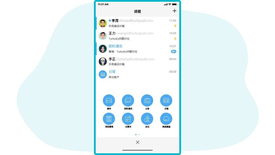 在手机上使用TurboEx移动邮件办公软件,处理邮件、文件、消息、任务,参加在线会议讨论,在出差旅途或者休假时期,随时可以处理工作业务